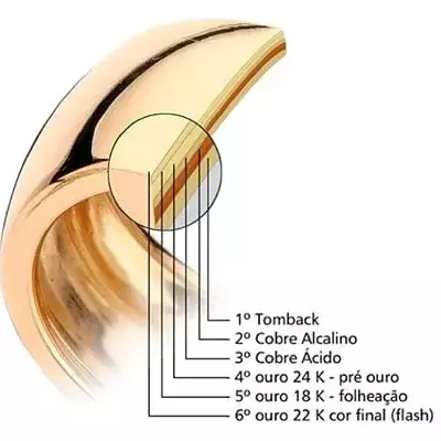 - As peças folheadas a Ouro 18K, tem aplicação de três camadas de ouro, sendo uma de Ouro 24K, outra de Ouro 18K e a última de Ouro 22K, garantindo assim sua beleza e acabamento similar ao de uma joia de ouro maciço.